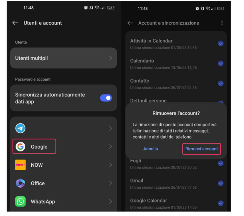 - Seleziona "Rimuovi account" (potrebbe variare leggermente a seconda del dispositivo).