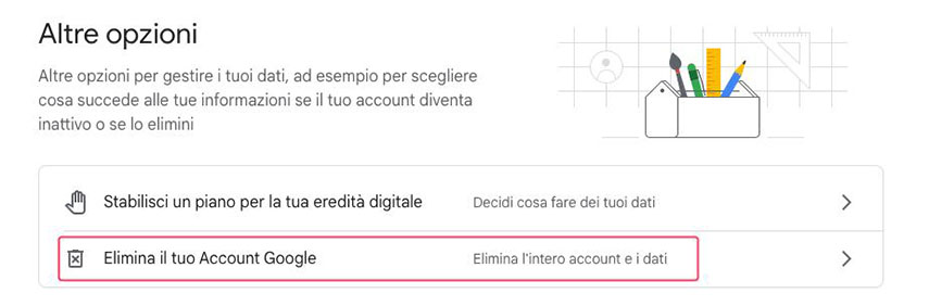 La cancellazione dell’account Google è un'azione irreversibile e comporta la perdita permanente di tutti i dati associati a quell'account, inclusi e-mail, documenti, foto e altro. Assicurati di eseguire il backup dei dati importanti prima di procedere con la cancellazione dell'account.